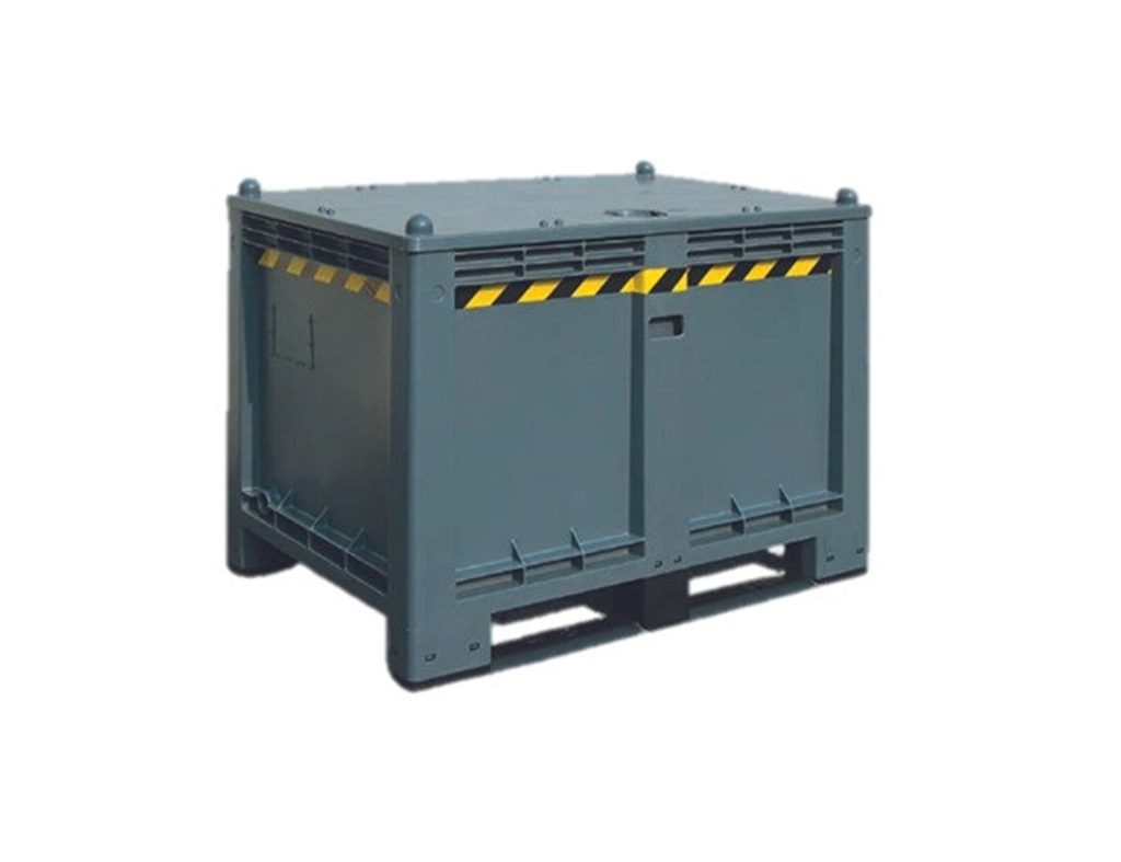 Container with lid for collecting used batteries, stackable and resistant to acids, fats, and solvents.