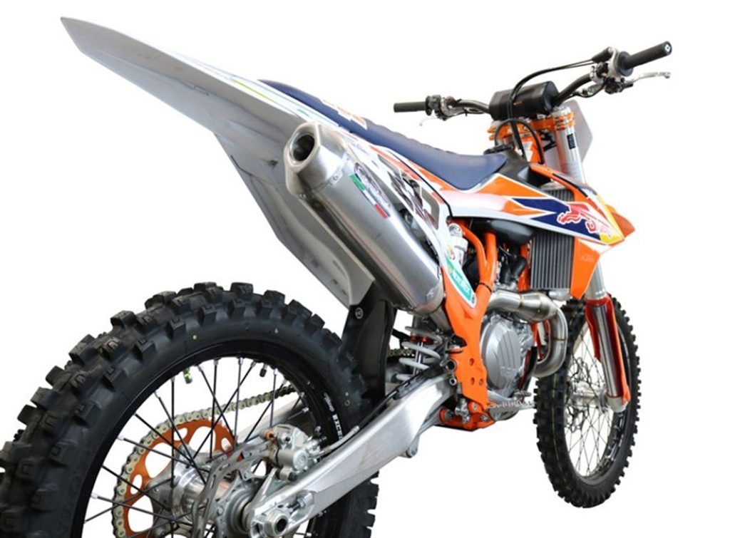 Complete RACING system for track use made in respect to FIM homologation limits, the kit consists of manifold with ULTRABOMB expansion and new PENTACROSS silencers line. Manifold and silencers are made of 304 stainless steel, average performance increase of 2cv, significant reduction in weight, developed thanks to the collaboration with the MXGP team.