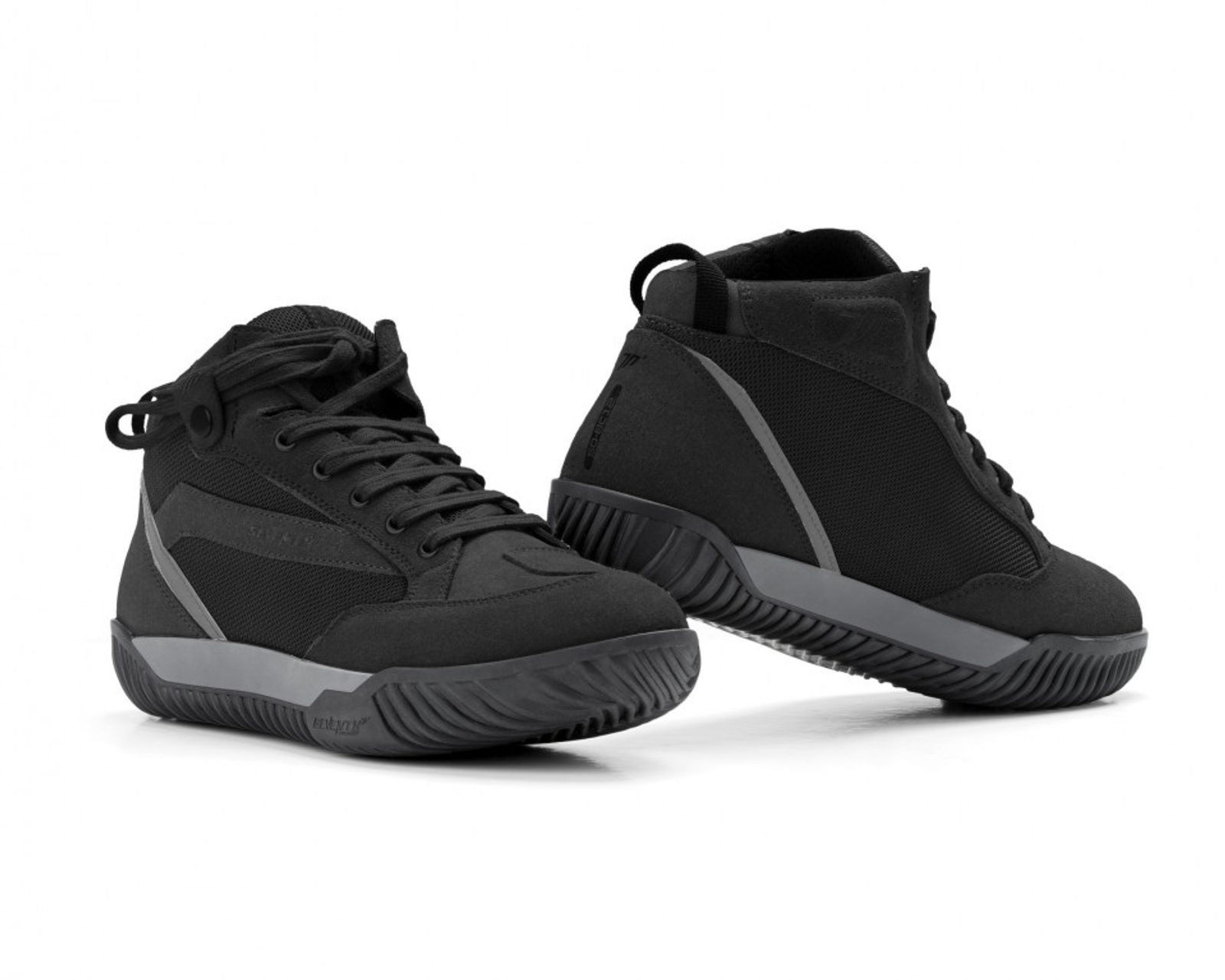 Urban waterproof low-top boot for men. Made of suede and nylon with built-in reflectors for greater visibility. Laced closure, with metal eyelets and lace fastening strap at the top for greater safety. Protections in heel and toe, with reinforcement in the instep for the gear shifting. Removable foam insole and non-slip rubber sole with exclusive design.