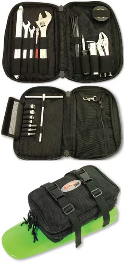Containing a similar range of tools as the rally pack, with the addition of a t bar socket set. This pack is designed to fit your mud guard. Simply bolt on the nylon base. The tool pack is secured with velcro and two security straps.