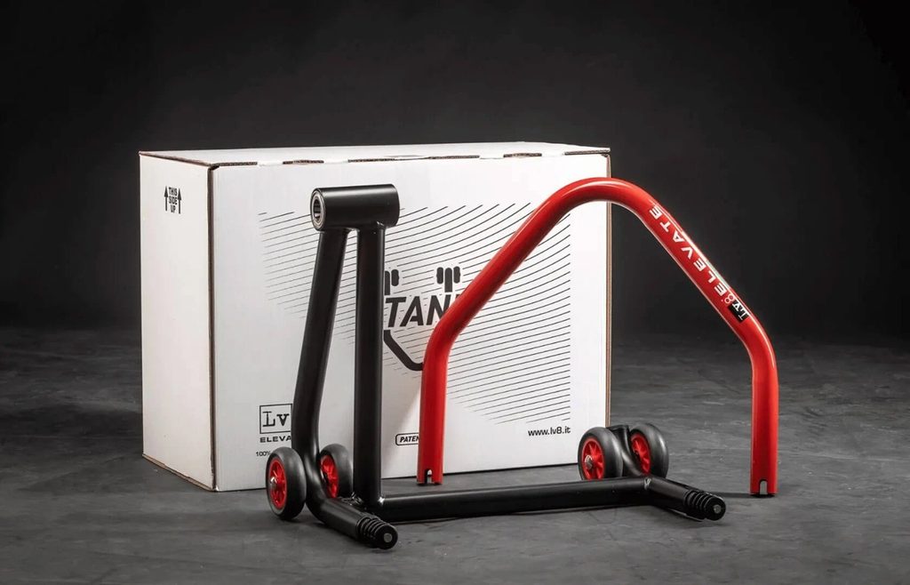 Patented single arm paddock stand (left side) supplied in 2 mountable pieces - can be assembled without the use of screws or bolts.
