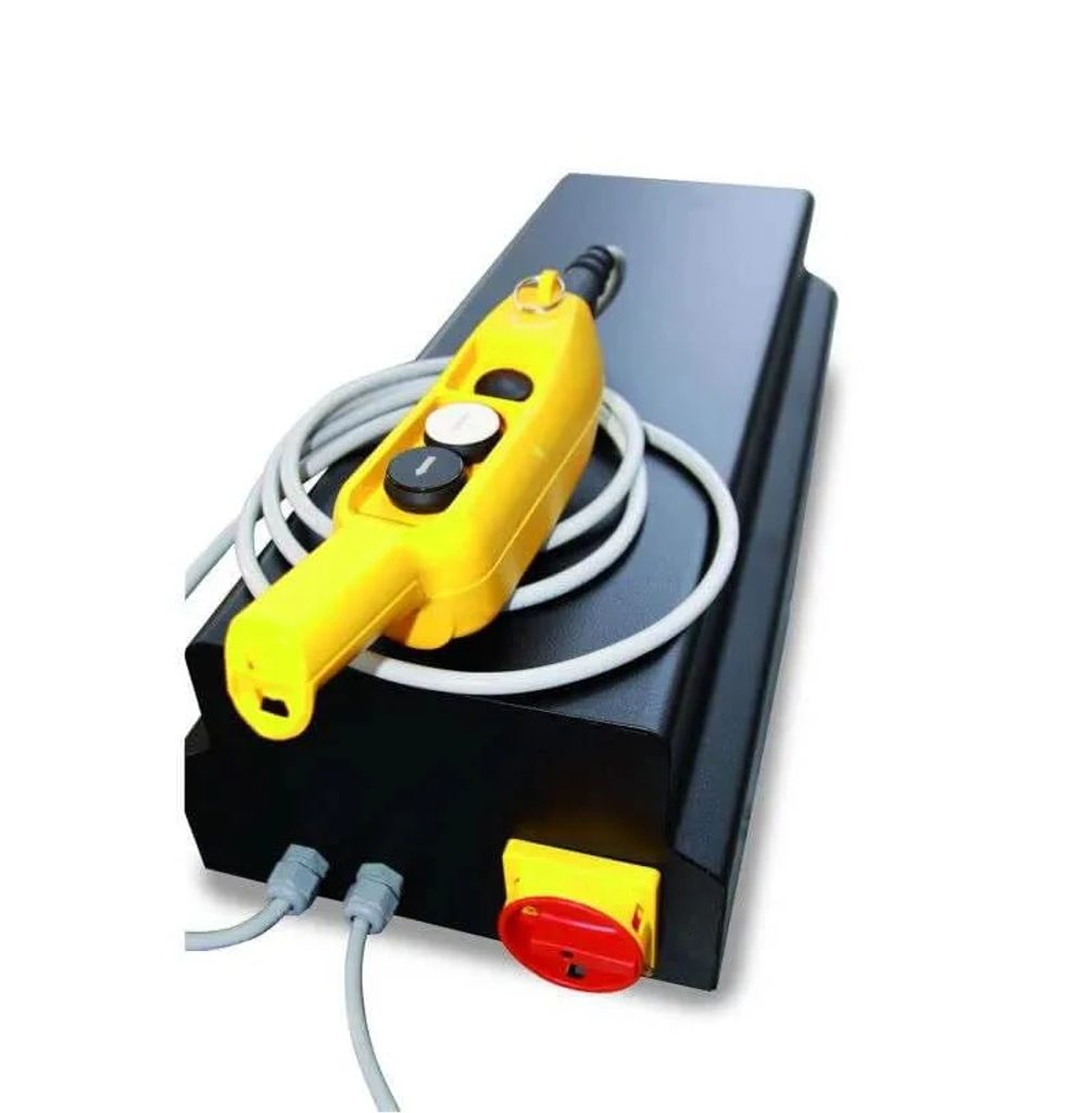Our LV8 Goldrake motorcycle lifts are supplied with a control unit, integrated into the base, protected by a powder coated sheet-metal cabinet with interlocked safety switch and a button panel equipped with magnet.
