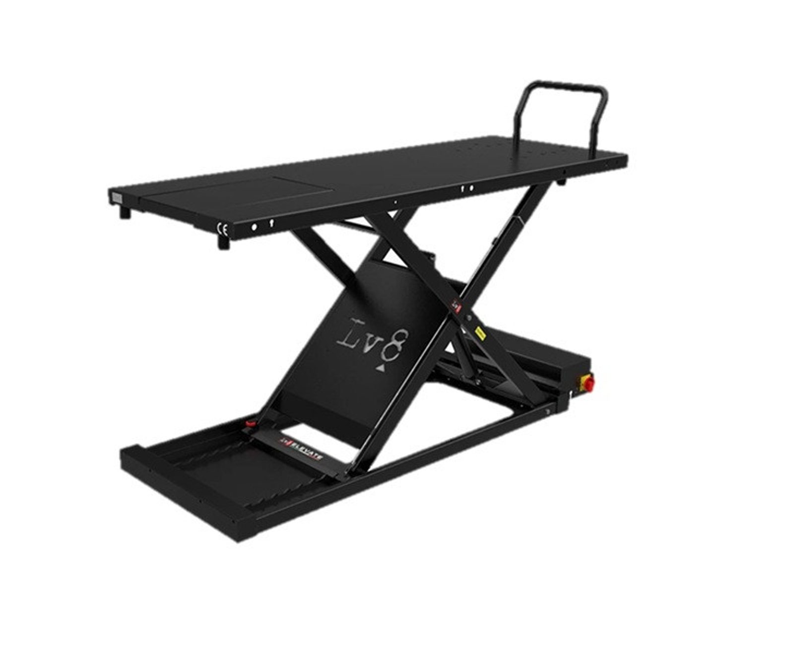 The platform of the LV8 NANO motorcycle lift is provided with removable gate to facilitate the demounting of motorbikes rear wheels and it is equipped with set-up for fitting wheel clamps, front extensions, ratchet tie downs and antiskid central covers.