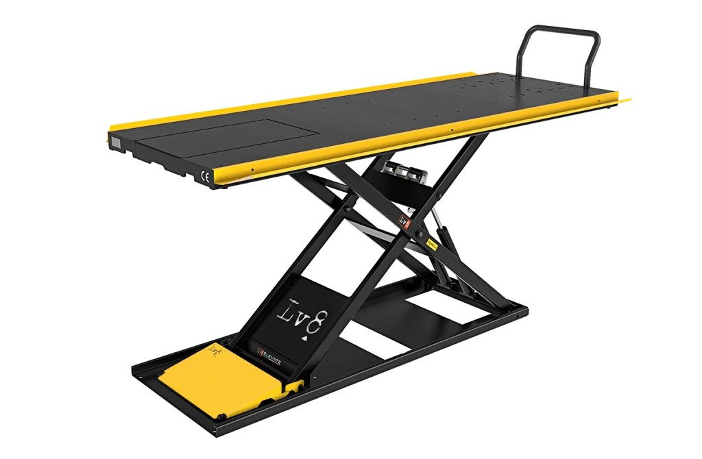 Thanks to its being only 7,5 cm (3”) high when closed and its retractable ramp it is the lowest and most safe motorcycle lift in the world.