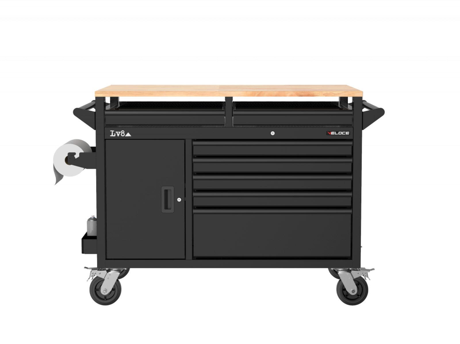 Multifunctional roller workbench L. 1200 mm with 14 drawers, double storage compartment with 2 doors and double perforated tool holder panel with canister holder, wooden worktop with 4 drawers underneath and side handles.