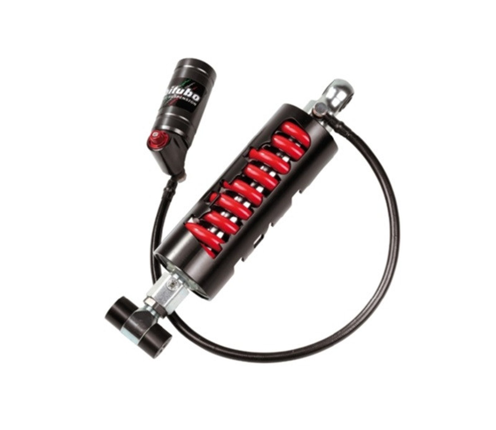 TECHNICAL FEATURES: Single chamber shock absorber, steel body, Ø14mm steel rod; gas pressurized with separated compensation chamber connected with a high pressure braided flexible hose; linear spring; external bell fabricated with a cage structure. This shock is fully re-buildable. Fully serviceable.