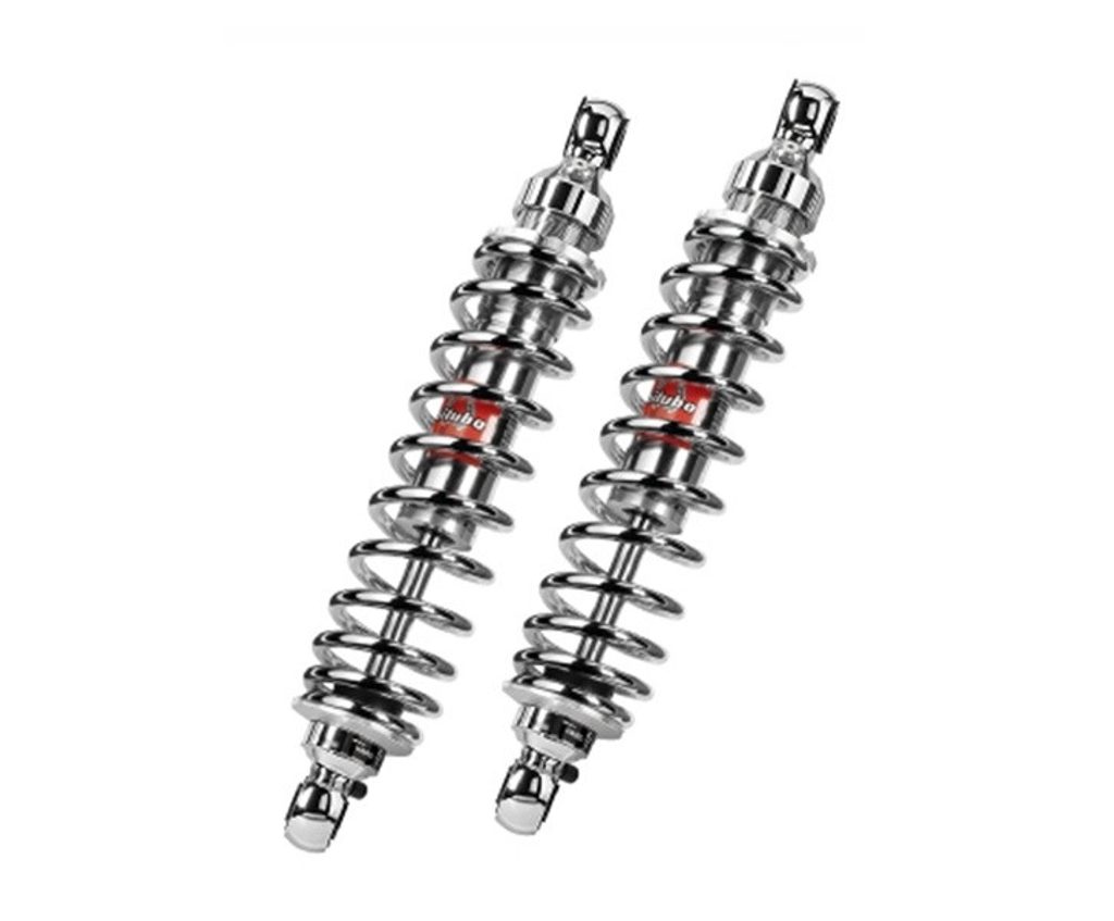 Twin rear shocks with same design of "WME0", this shock has higher lenght (+10mm) of the original, adress to whom want ahigher setting of his own bike. Available in colour range "52V2" total black for more classic looks, and "53" all chrome version.