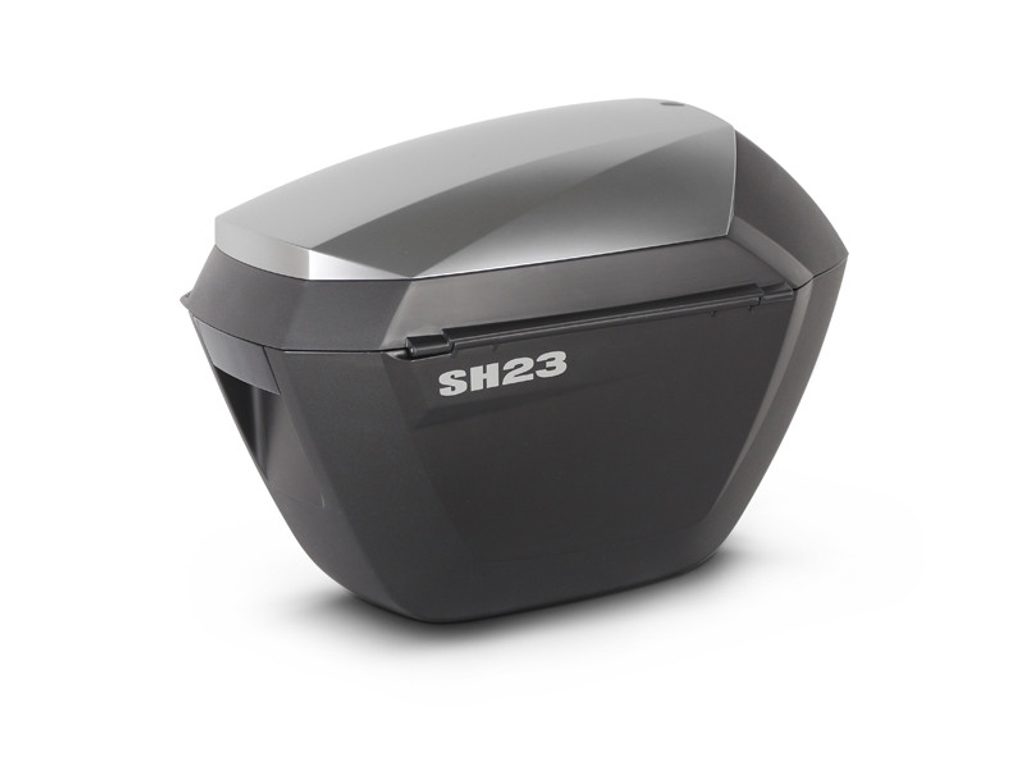 The SH23 side cases stand out for their elegance, lightness, and functionality. They are highly aerodynamic and remain strong and watertight. The top-opening function allows the rider to access the inside of the case without getting off the bike.