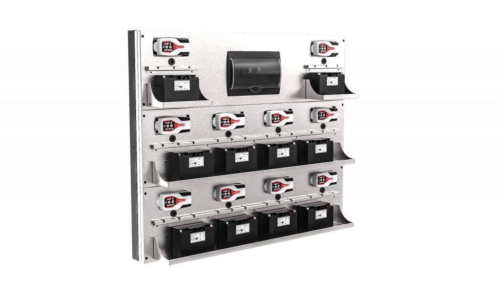 Stainless steel wall panel with predisposition for housing 10 chargers and electric panel (optional)