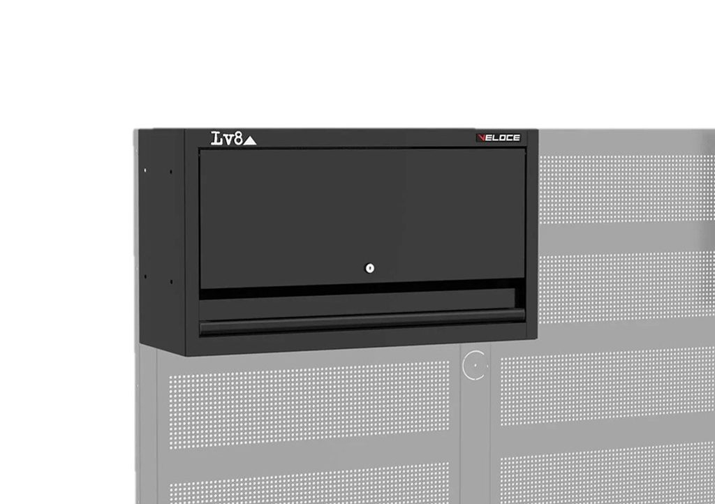 Nástěnná skříňka s uzamykatelnými dvířky a madlem z černě eloxovaného hliníku. Lze ji integrovat do pracovních stolů LV8 VELOCE s nástěnným panelem pro držáky nářadí.