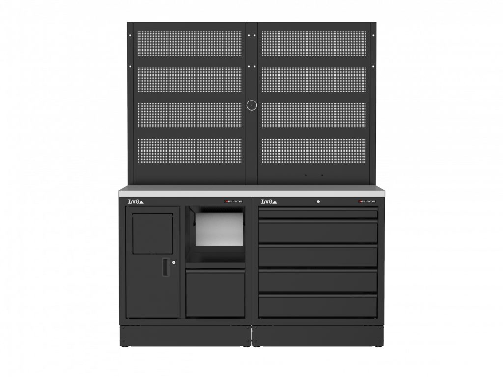 Workbench L. 1600 mm configured with service cabinet with waste bin, paper compartment and storage drawer, 5-drawer cabinet with key lock. Wooden top, double perforated tool holder panel and double provision for an electric socket. Also available in stainless steel or melamine top versions.