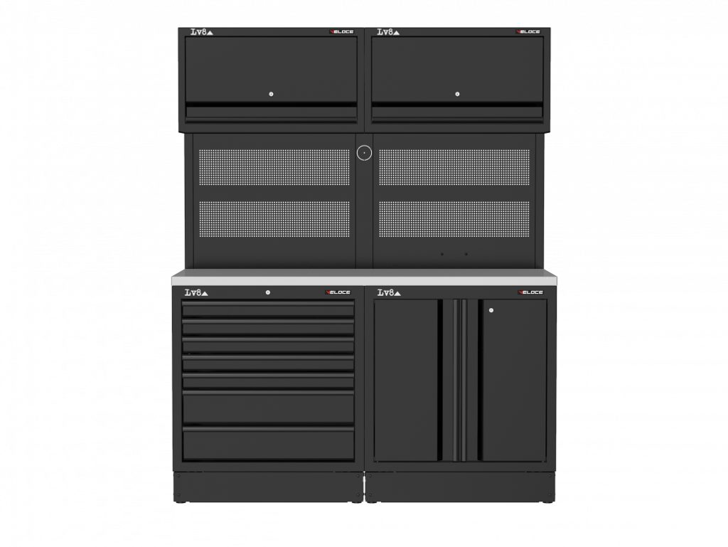 Workbench L. 1600 mm with 7-drawer cabinet, 2-door cabinet with adjustable shelf and key lock. Wooden top, double perforated tool holder panel with 2 wall storage cabinets and provision for an electric socket. Also available in stainless steel or melamine top versions.