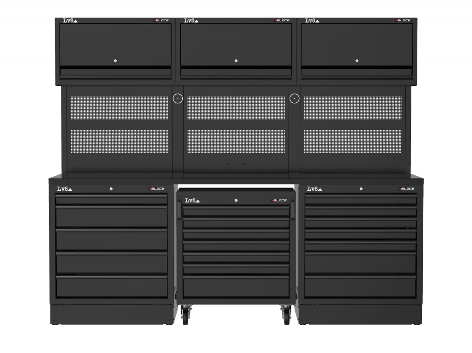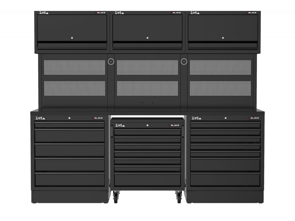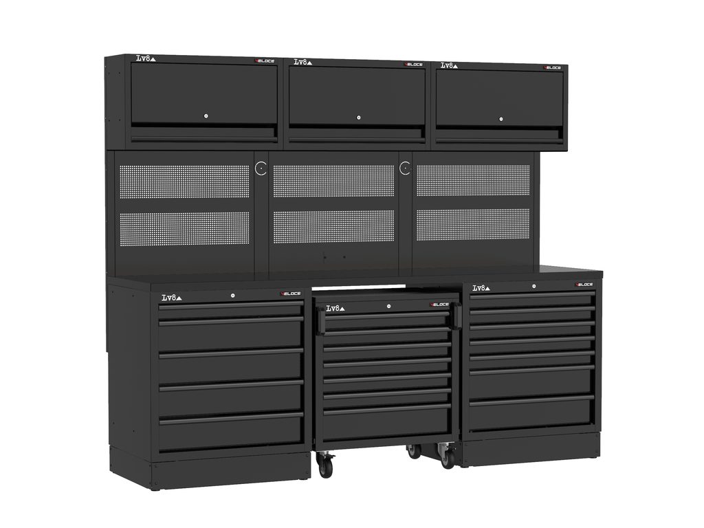Workbench L.2400 mm configured with 5-drawer cabinet, 7-drawer tool storage trolley and 7-drawer cabinet. Wooden top, 3 perforated tool holder panels with wall storage cabinets and provision for an electric socket. Also available in stainless steel or melamine top versions.